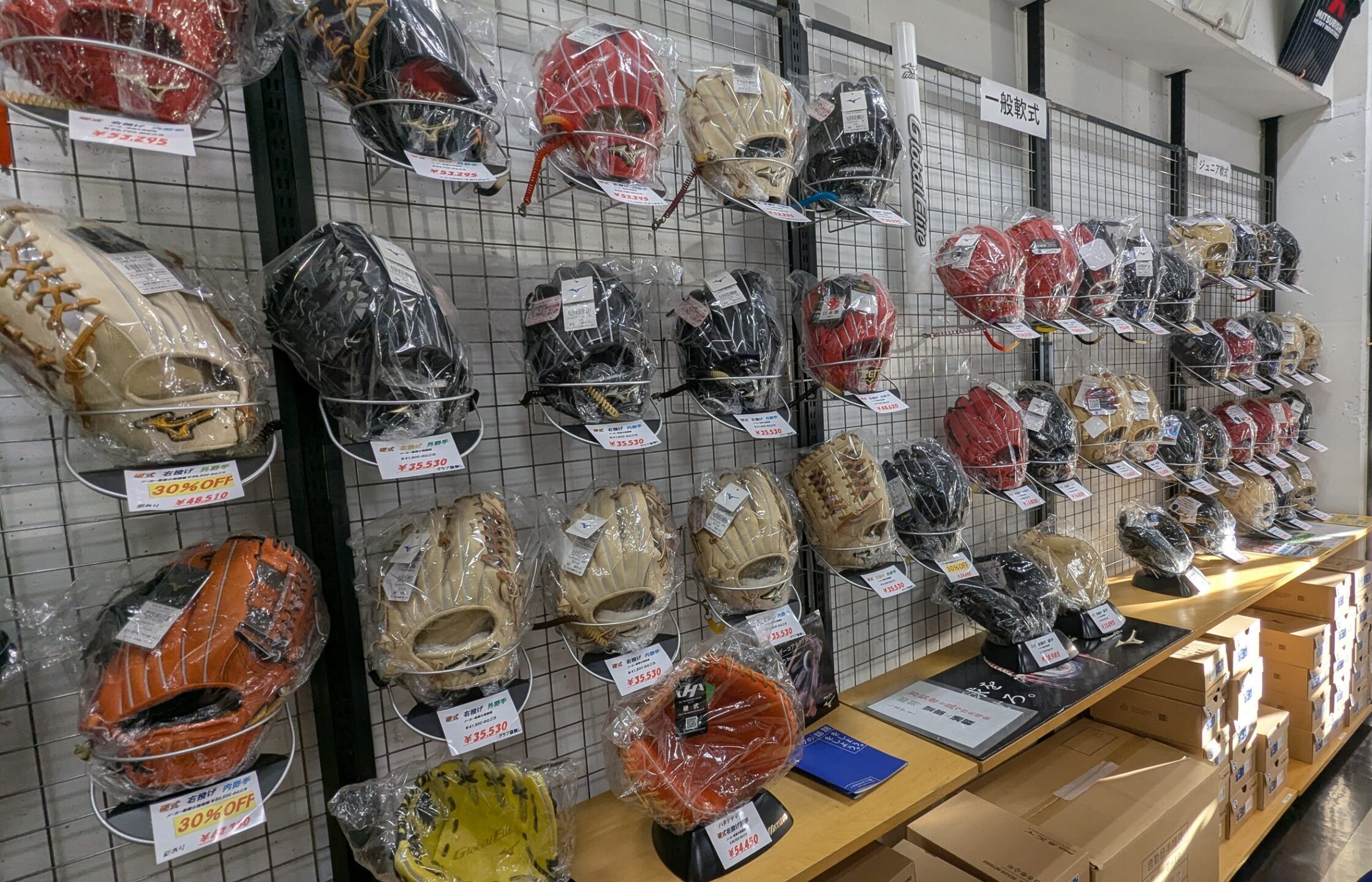 神戸市須磨区の店舗では、スタッフが厳選したグラブ・バット・スパイクを取り揃えており、実際に手に取って最適なギアをお選びいただけます。また、チームや選手に合わせたオーダーや刺繍加工、購入後のアフターサポートとしてグラブやスパイクなどの用具修理も承っております。